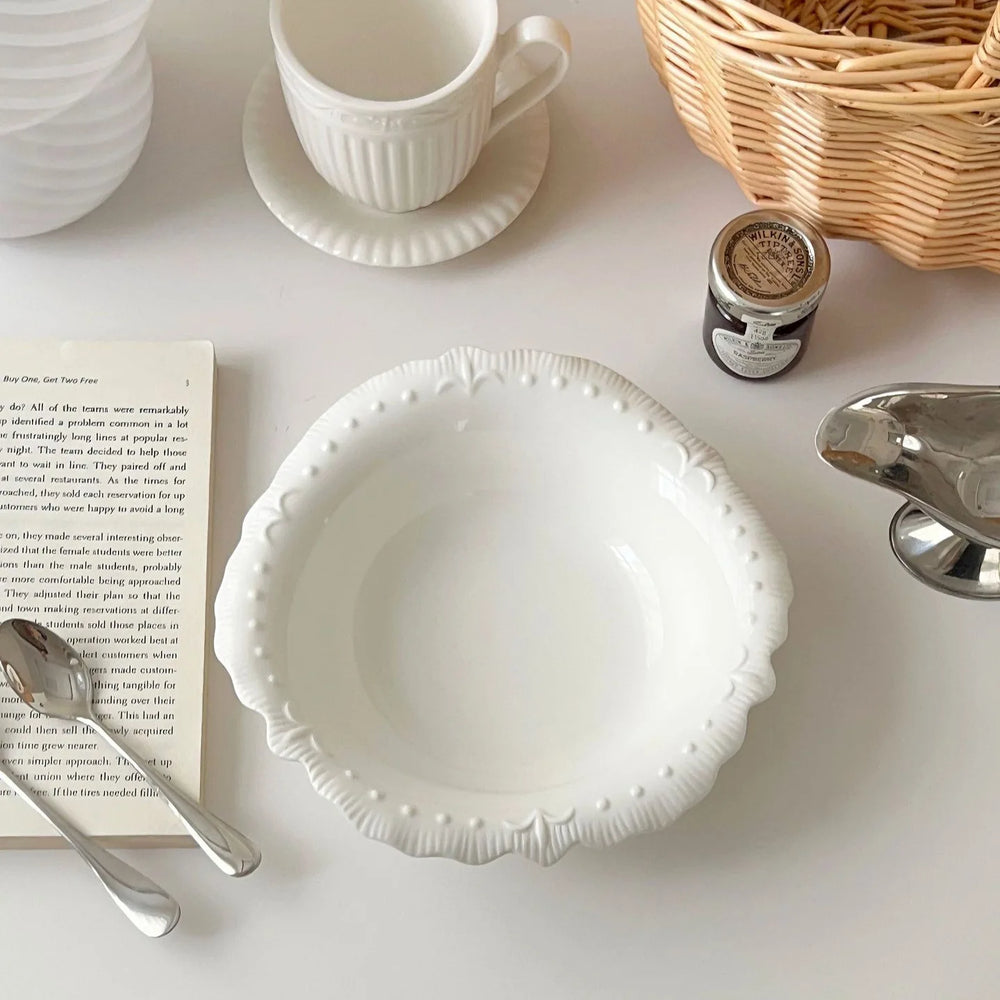 French Style Embossed Lace Ceramic Bowl Household Solid Color Round Simple Fruit Bowl Western Restaurant Salad Tablewares