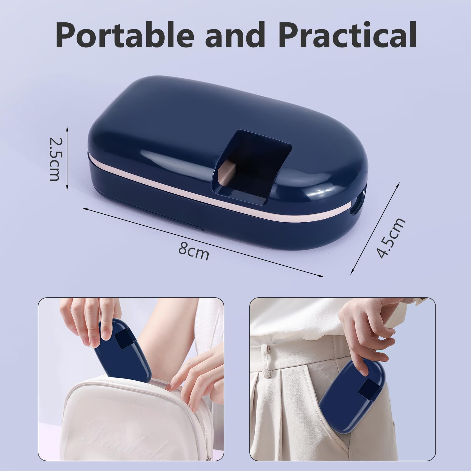[Space-saving Design] Includes a back storage box (3.5 cm x 2.6 cm x 0.8 cm) for spare pills. This portable tablet splitter fits into wallets, pockets, or handbags, making it perfect for daily use or travel. Suitable for seniors, children, and pets needing precise pill dosing